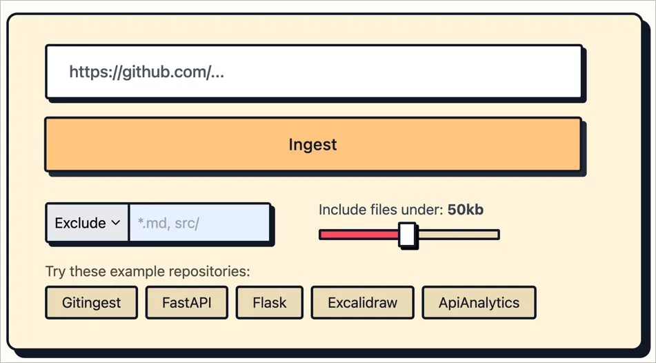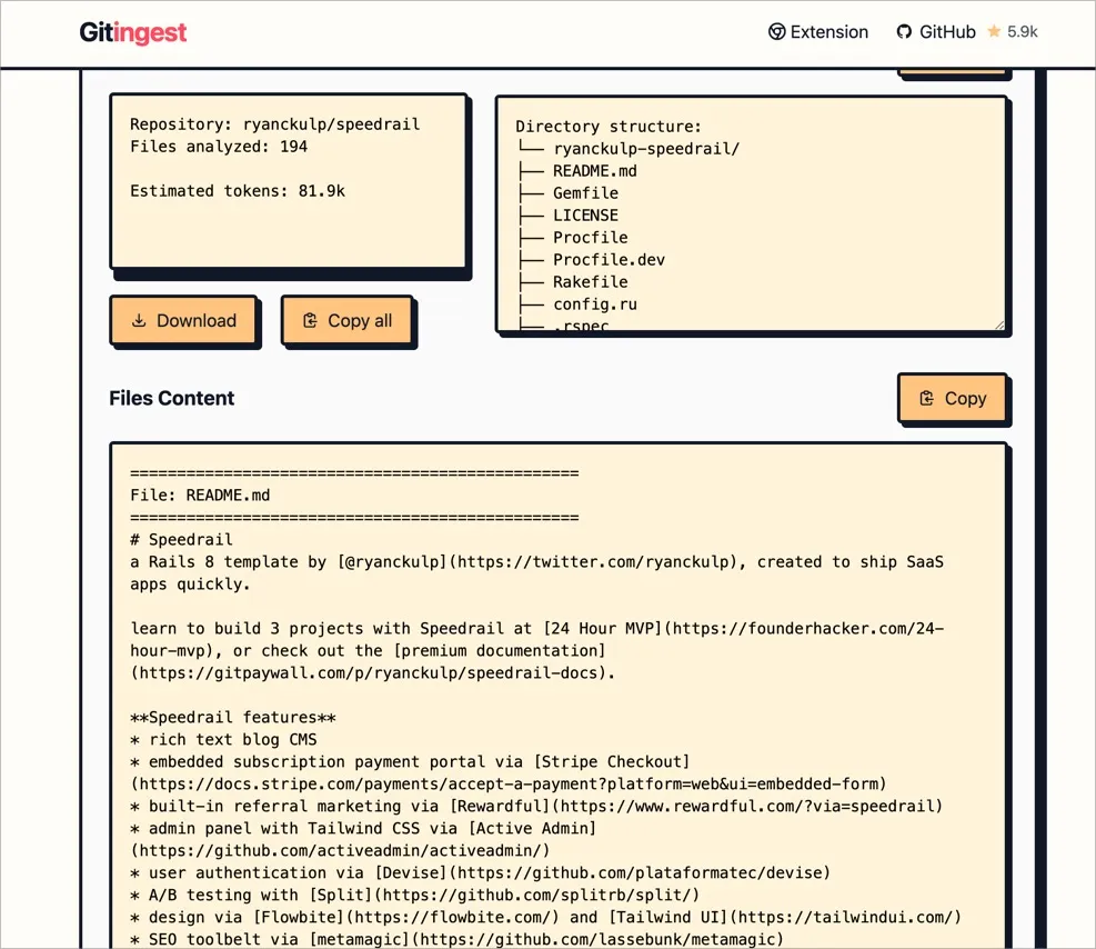 Use Gitingest to convert github repositories into markdown. Markdown format could then be added to any of your AI chats so that you could ask any question. What I like about this tool is that I just have to replace the URL. So for instance, if I have this URL — https://github.com/ryanckulp/speedrail, I just have to replace this with https://gitingest.com/ryanckulp/speedrail for using the tool. I don’t have to think twice on which tool to even use, the switch of context is quite easy and not so difficult for you to remember.