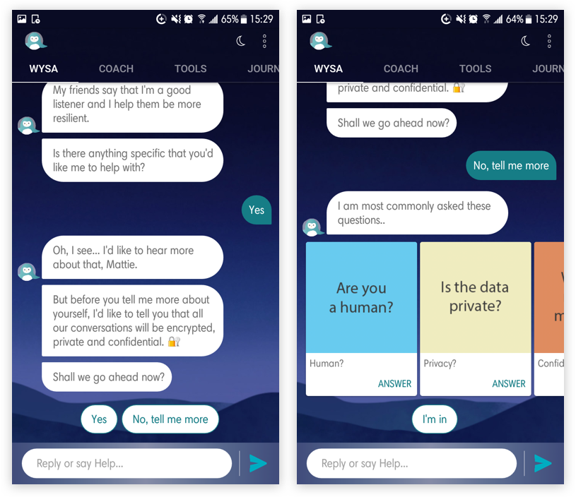 The app offers pre-populated short answer suggestions, and suggested options for larger, more informational outputs with minimum user input required. Offering such pre-set text helps direct conversations and limit chances of breaking the conversational flow.