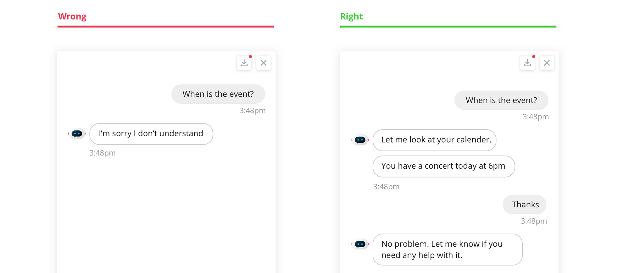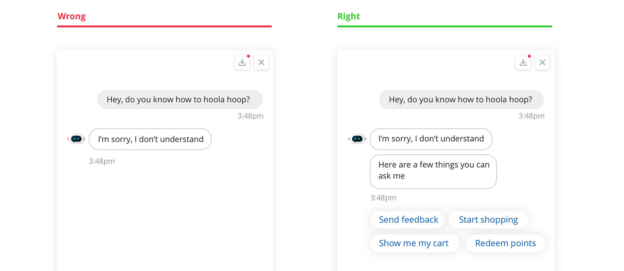 Most people will just give up when chatbots or assistants say something similar to “I’m sorry, I’m still learning”, “I’m not sure I can help with that”.