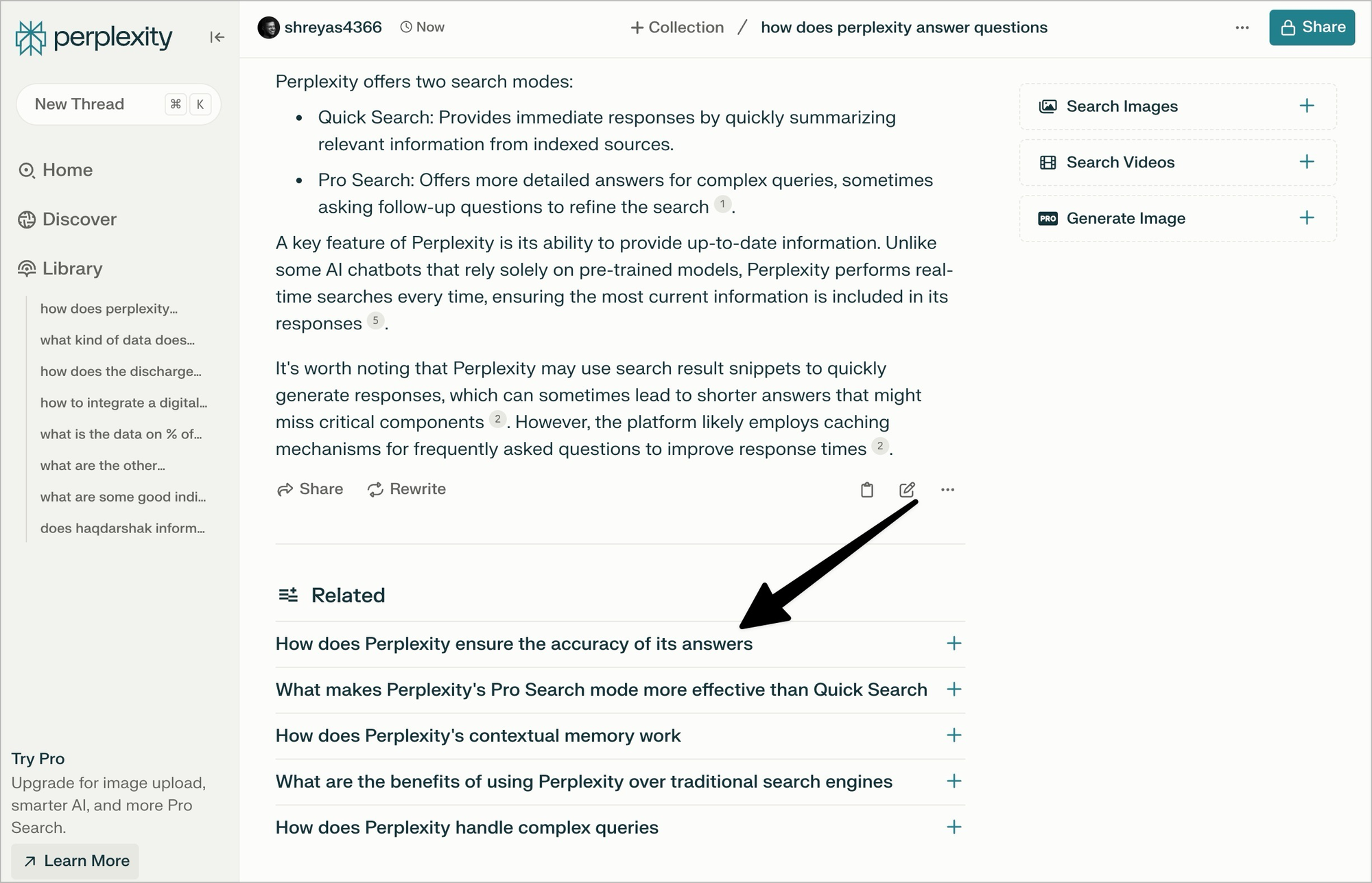 In the above example, Perplexity AI continues to provide cues for digging deeper into the rabbit hole, by providing suggested questions which the user can ask after having answered the question. This helps create a flywheel effect for the user curious about exploring a topic.
