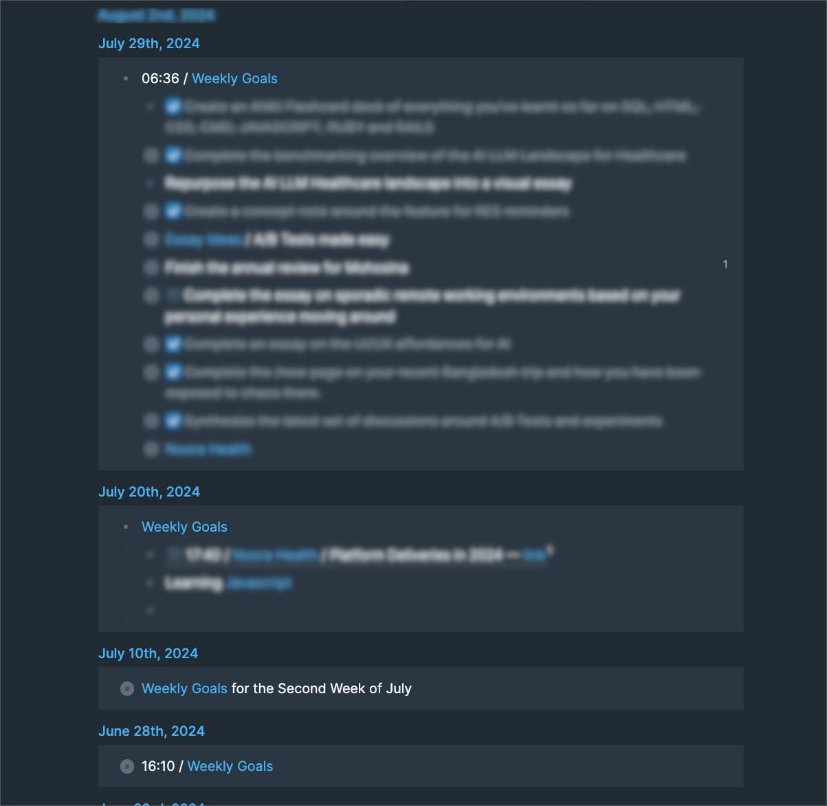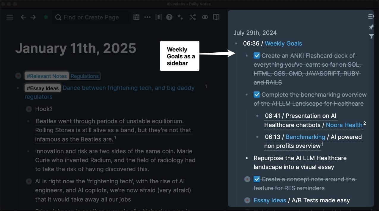 The weekly goals always lingers as a pinned sidebar while I continue to journal weekly. As I continue with my day and work, I continue to check the boxes on the things I shipped on a weekly basis