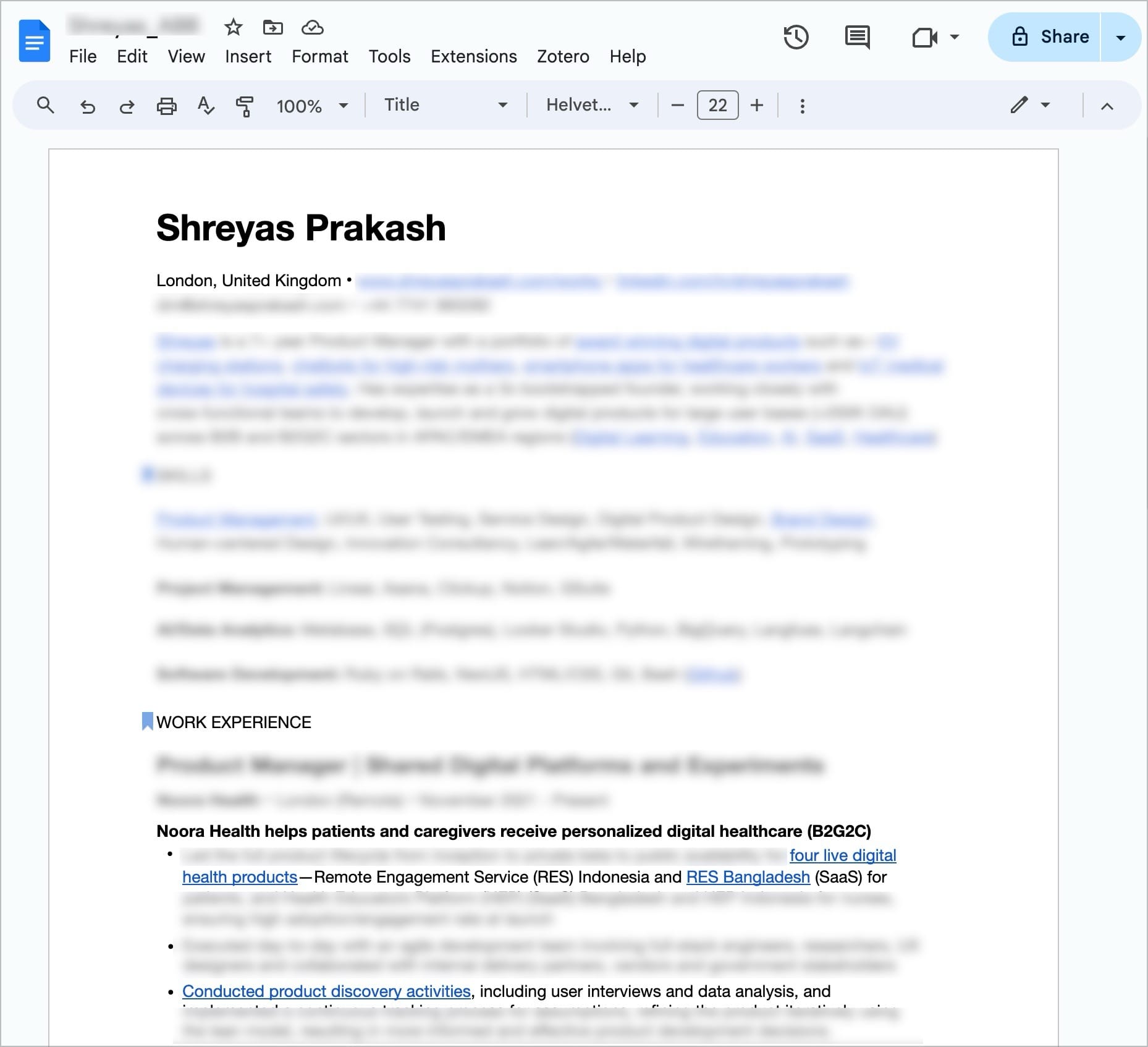 While sticking to conventions when it comes to a resume format, the downside here is that the output looks very vanilla. All of us, following the same format, looking to stand out in the sea of applications, how do we do it? One technique through which I’ve been able to creatively experiment, while continuing to stick to conventions is by using hyperlinks in my resume. If I’ve a body of work which is online, and that I can link to, I do. In this way, the hiring manager can read concisely and expand on any of the links if they choose to do so. Hyperlink provides this affordance.