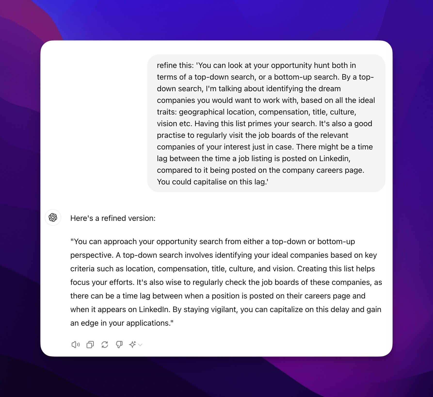 Used Perplexity to do rapid user/company research before talking to anyone from the respective company. There is a difference between asking thoughtful questions, and asking for the sake of asking. We often fall into the trap of the latter category. To base a good question, I first start with unravelling some astute observations, which even internet or Perplexity can’t give me a direct answer. It’s these questions which I often bring up when the interviewee asks, ‘Do you have any questions for us?’. This is a moment worth capitalising on.