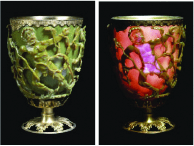 Take the Lycurgus Cup as an example. It was made in 4th century by Romans using dichroic glass, which shows a different colour depending on whether or not light is passing through it: red when lit from behind and green when lit from in front.