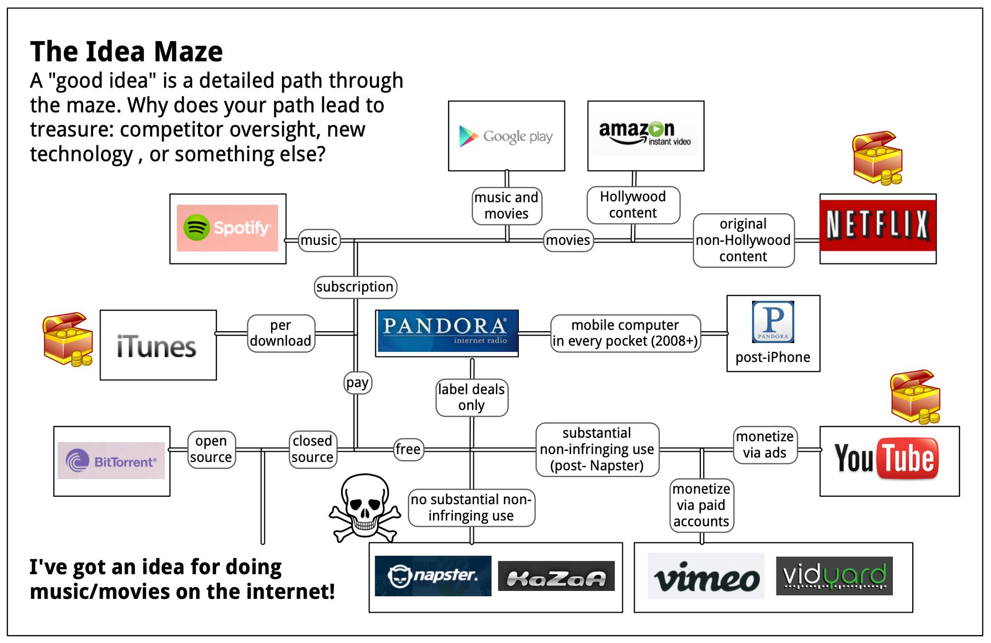 Founders can also be seen shifting across various pathways while trying to achieve the holy-grail of product-market fit. Balaji coins this term called an ‘Idea Maze’ where you are navigating various paths you could take and how those paths could either end up in success (exiting the maze) or failure (hitting the roadblock).