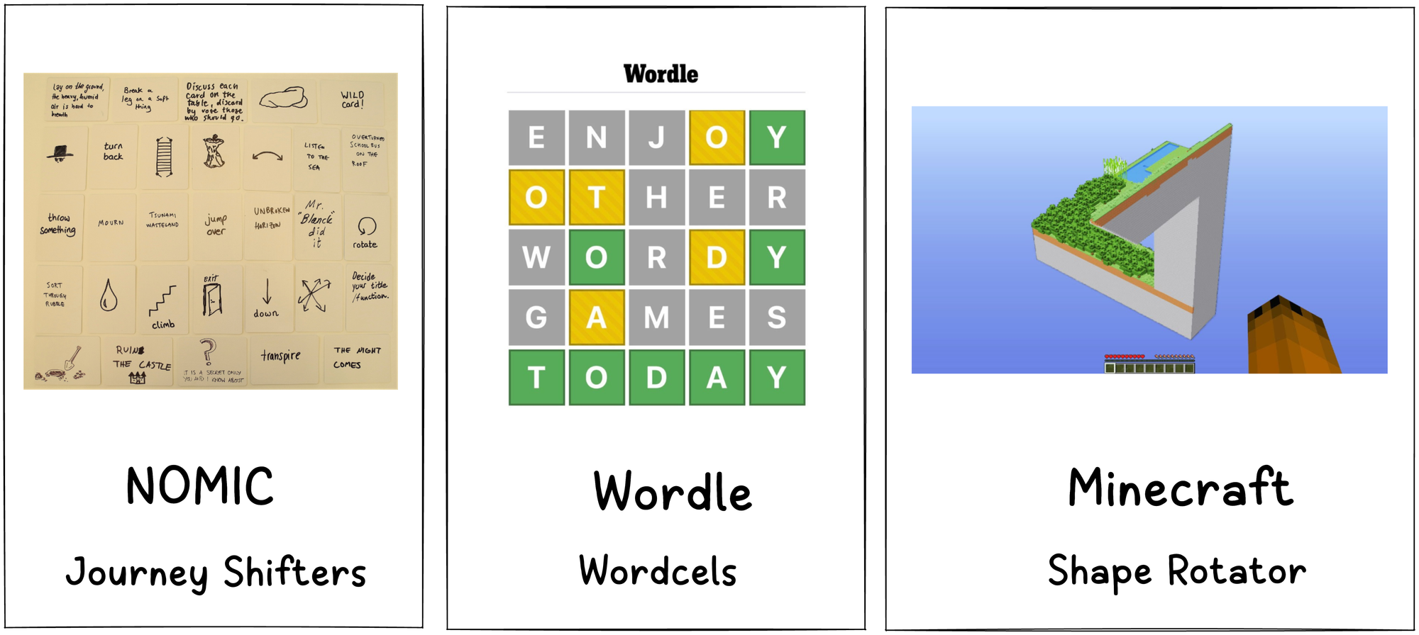 If we were to take the metaphor of games, the shape rotator would be playing Minecraft, the wordcel would be acing the Wordle, Scrabble, Crosswords and the journey-shifter would be playing NOMIC (the game where the rule of the game is to change the rules of the game)