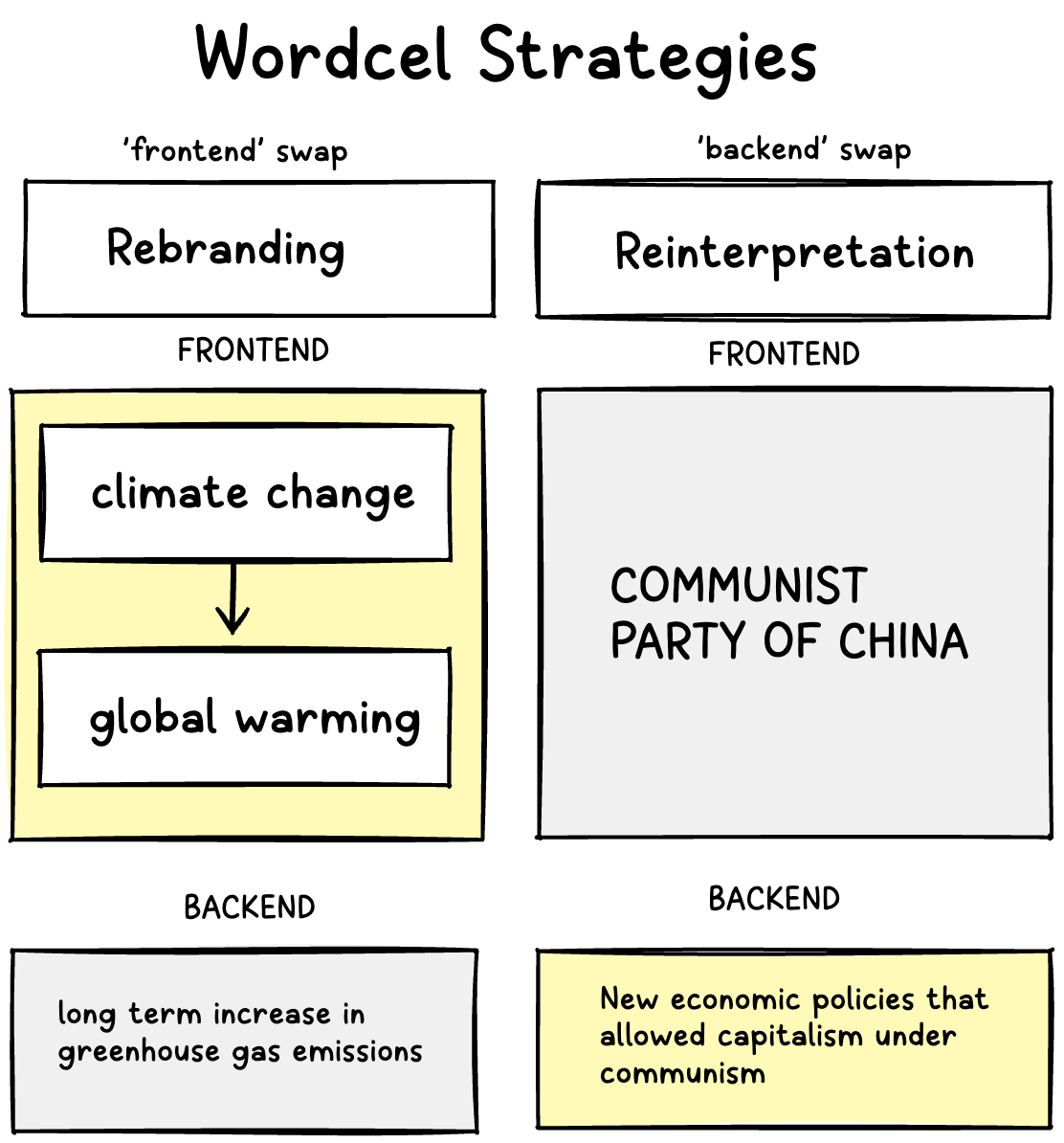 - Backend swap — Swapping the backend while keeping the frontend constant (aka reinterpretation). Examples include: (a) Chinese communism under Deng Xiaoping [2]— Under his regime, the branding of the Chinese Communist Party was kept intact while embracing capitalism. (b) New Economic Policy (NEP) in Soviet Russia — Lenin introducing NEP in the early 1920s, reintroducing limited private enterprises (capitalism) under the guise of socialism.