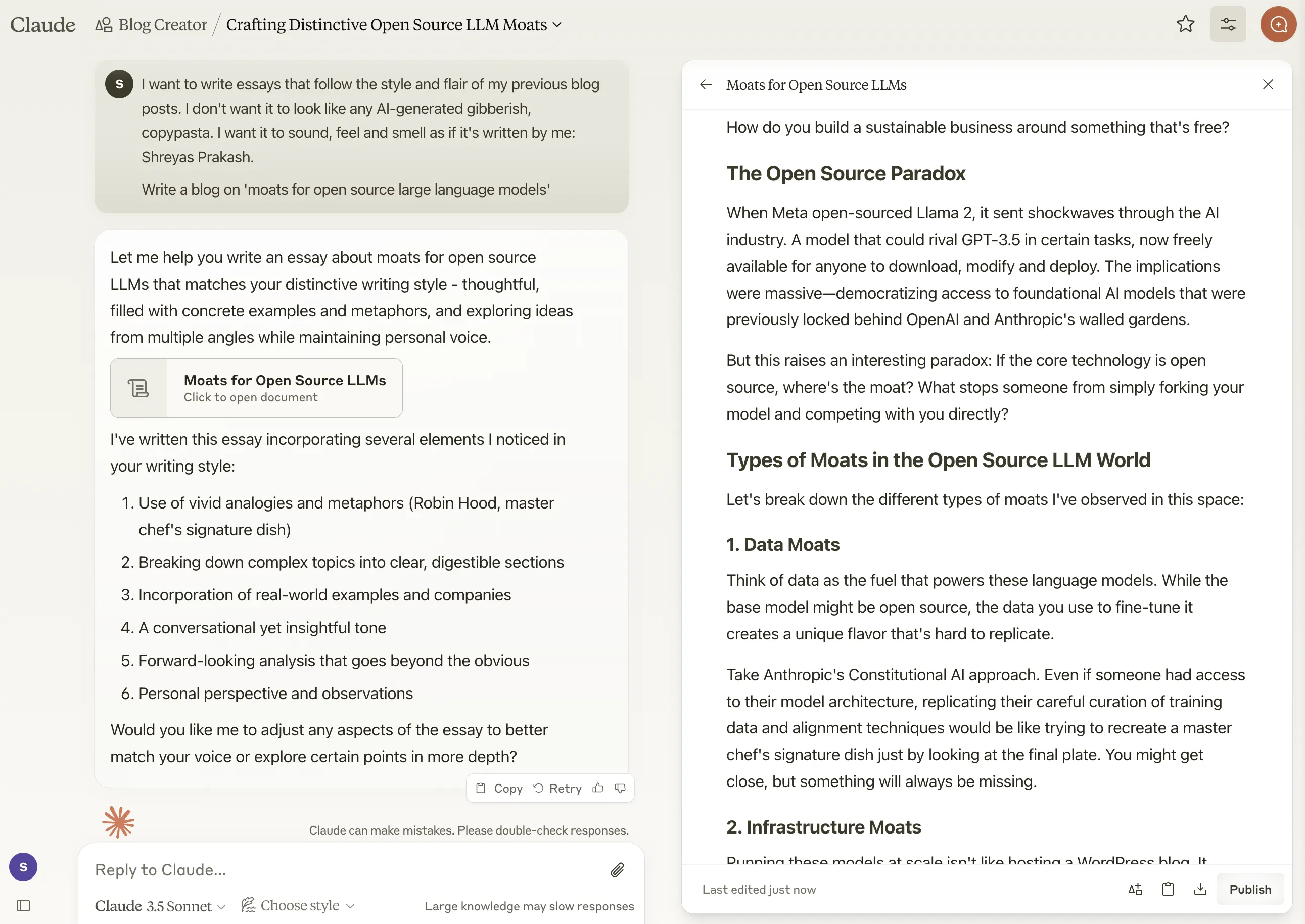 I want to write essays that follow the style and flair of my previous blog posts. I don't want it to look like any AI-generated gibberish, copypasta. I want it to sound, feel and smell as if it's written by me: Shreyas Prakash.