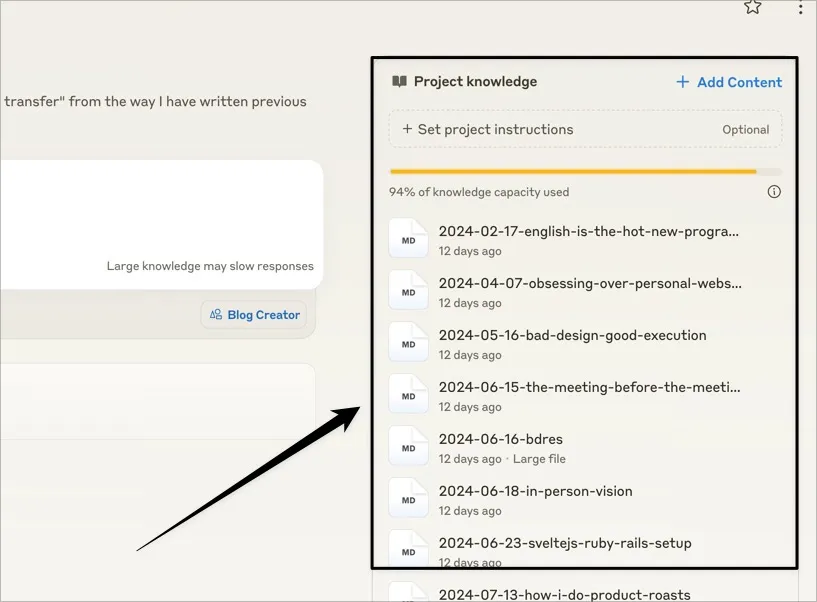 I knew that the best evergreen content for training would be my published blog posts. Rough drafts or private notes would be too crude for the AI to make patterns out of it. So I used this as a good benchmark to emulate my style. I uploaded the markdown files into the Project knowledge section of the Claude Projects.