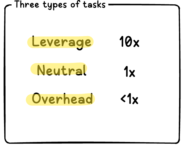 This helps me to better manage my time and energy to double down on the High leverage tasks for which I would do extra homework and background preparation. While scheduling my high leverage, neutral and overhead tasks, it was also important to ensure I had the right amount of energy to complete the tasks as well.