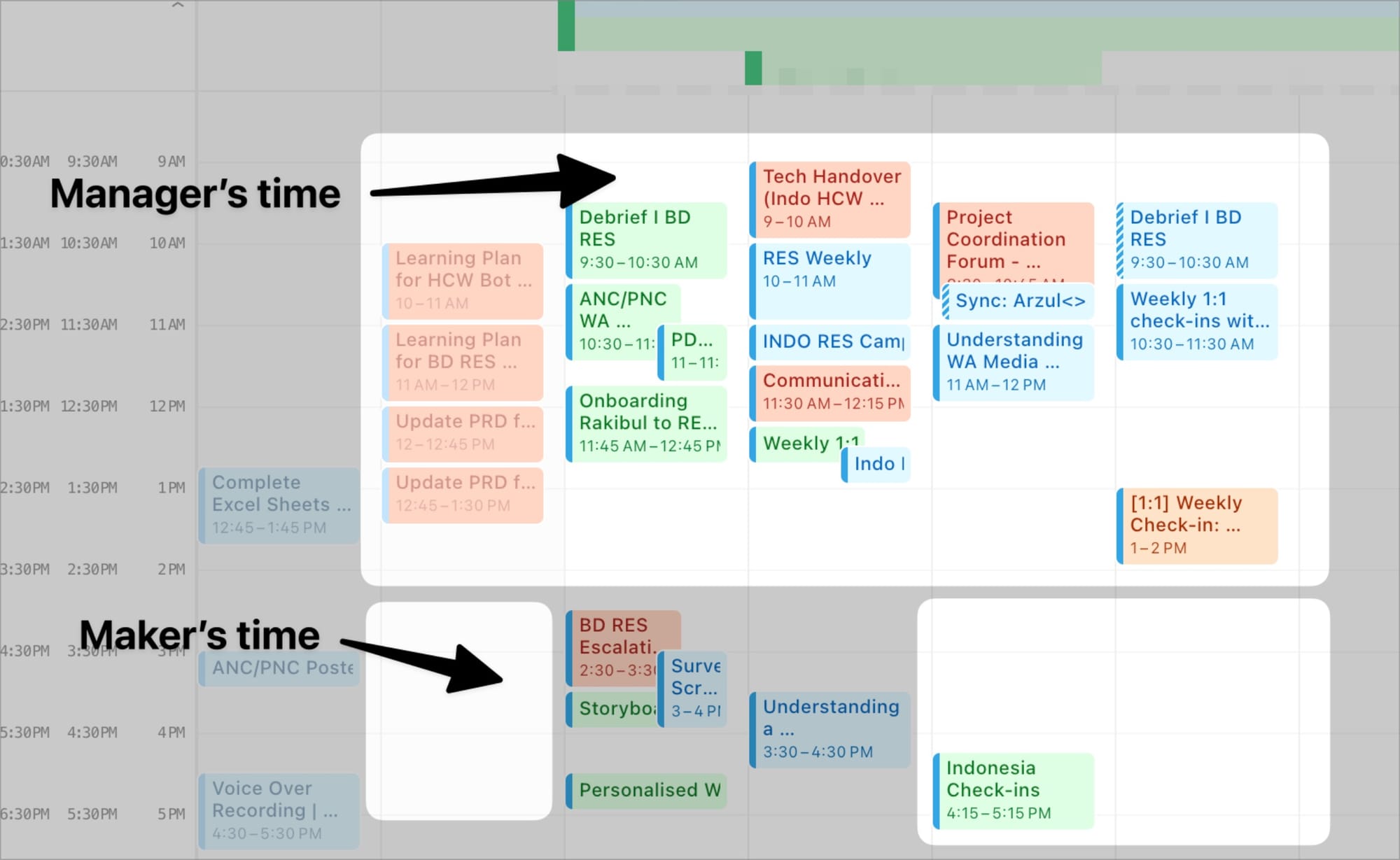 According to Paul Graham, Maker time refers to the uninterrupted, focused time that individuals need to do their best work. This specifically requires large blocks of time to get into a flow state and produce high-quality work.